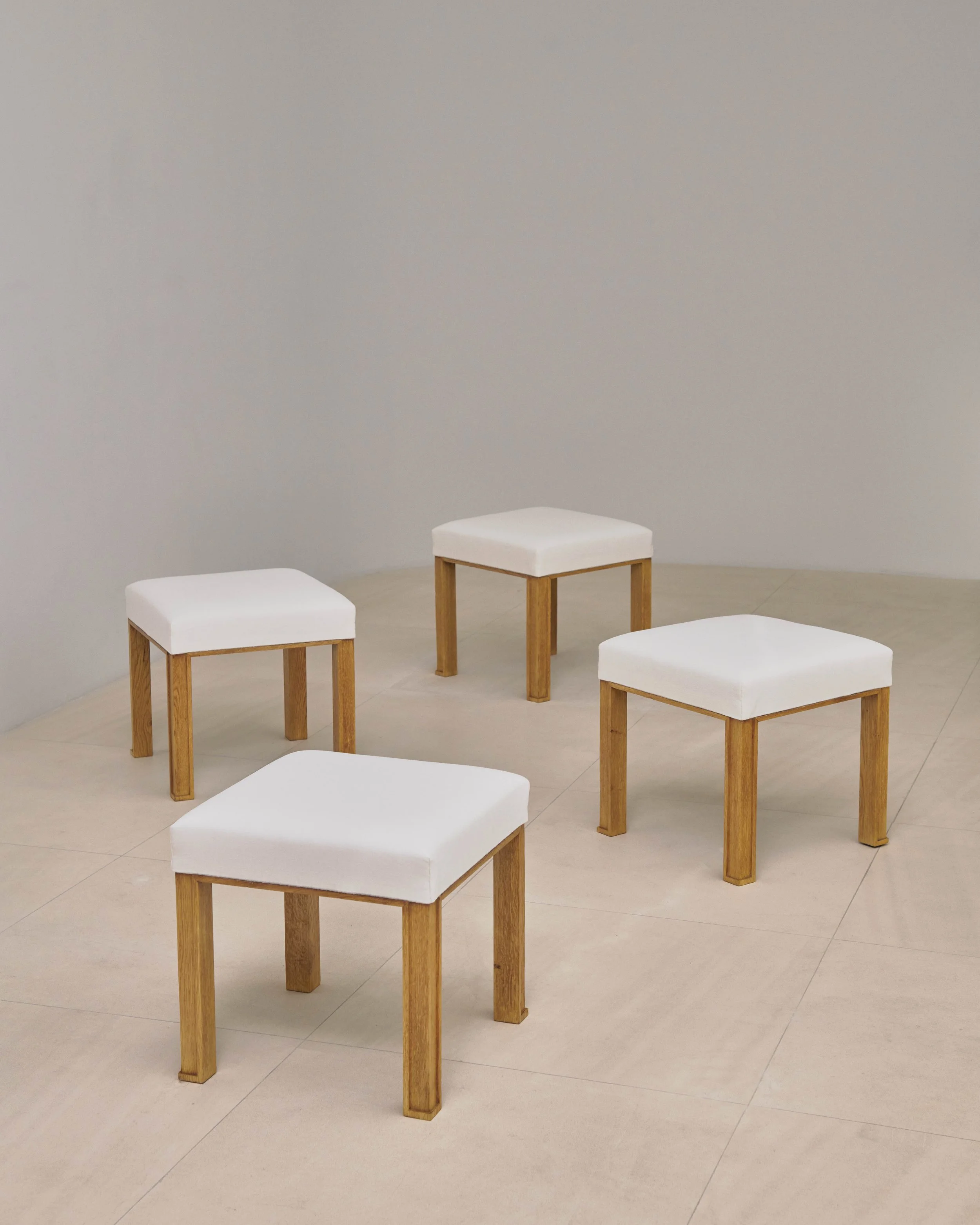 Set of 12 seatings including two armchairs, six chairs, and four stools in solid carved blond oak, circa 1940