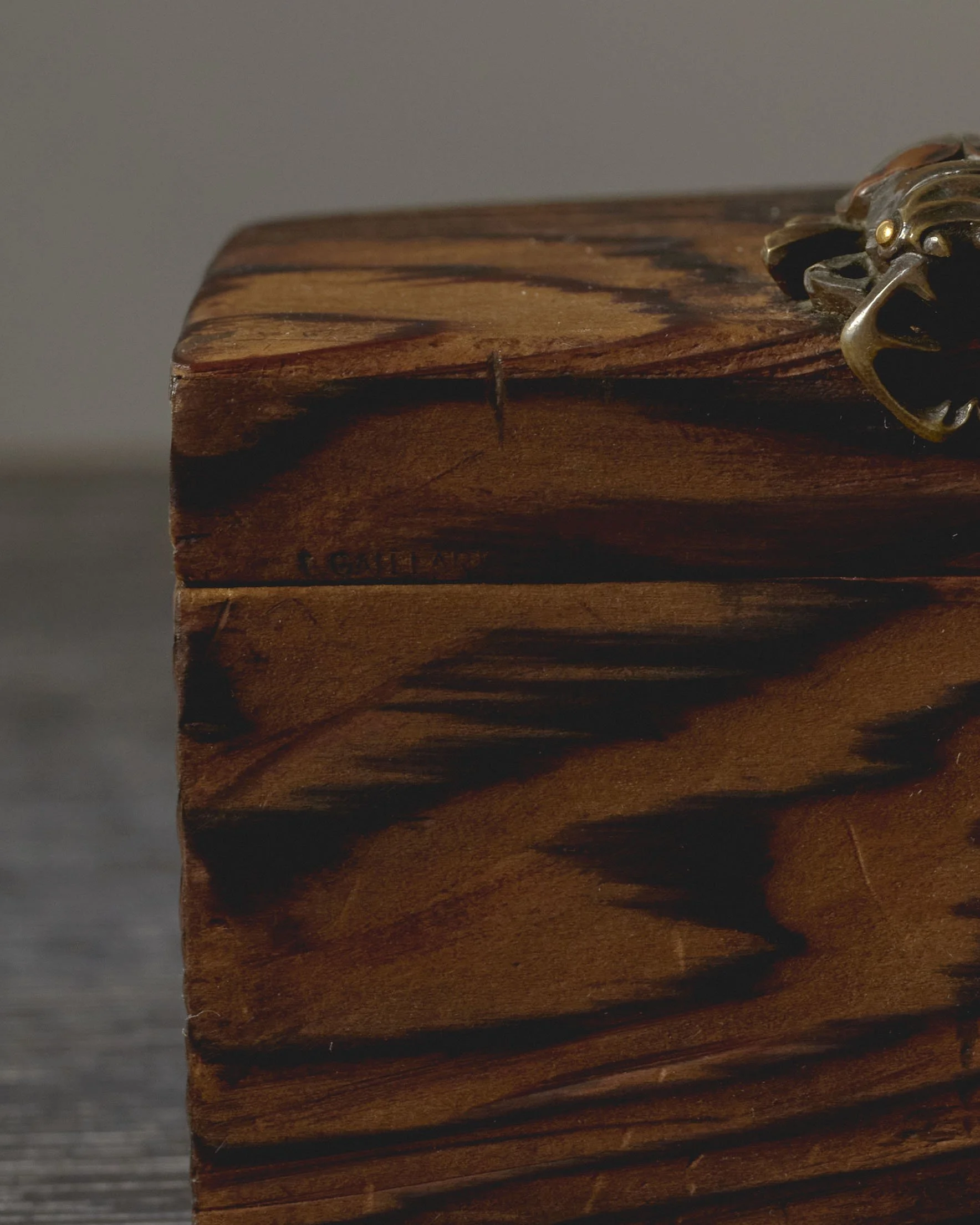 Cigarette box in burned pine decorated with a beetle in patinated bronze, circa 1907