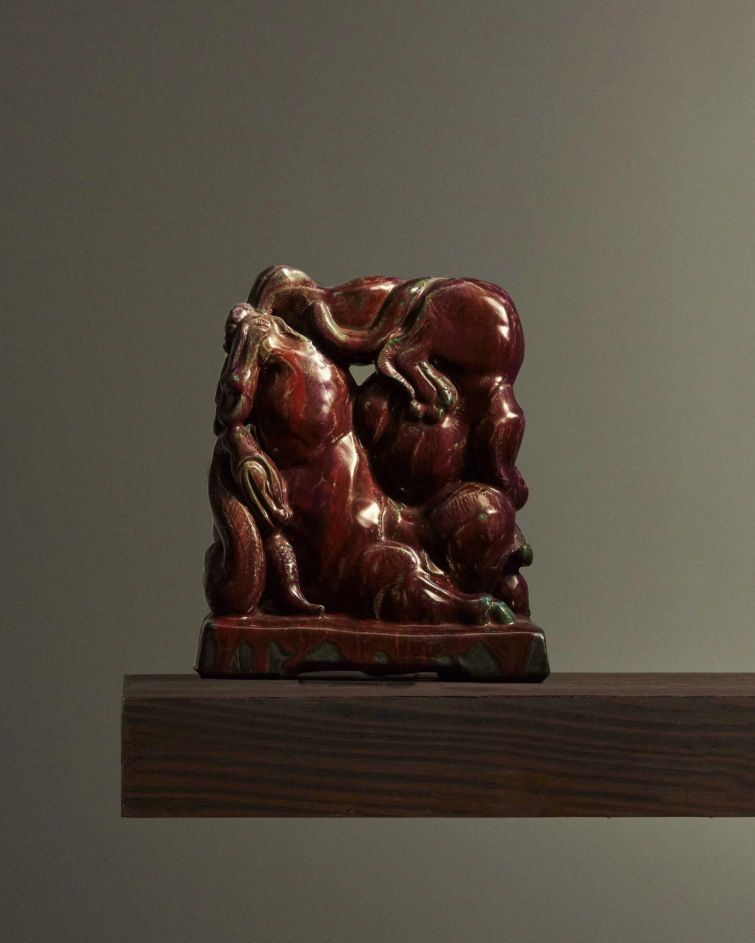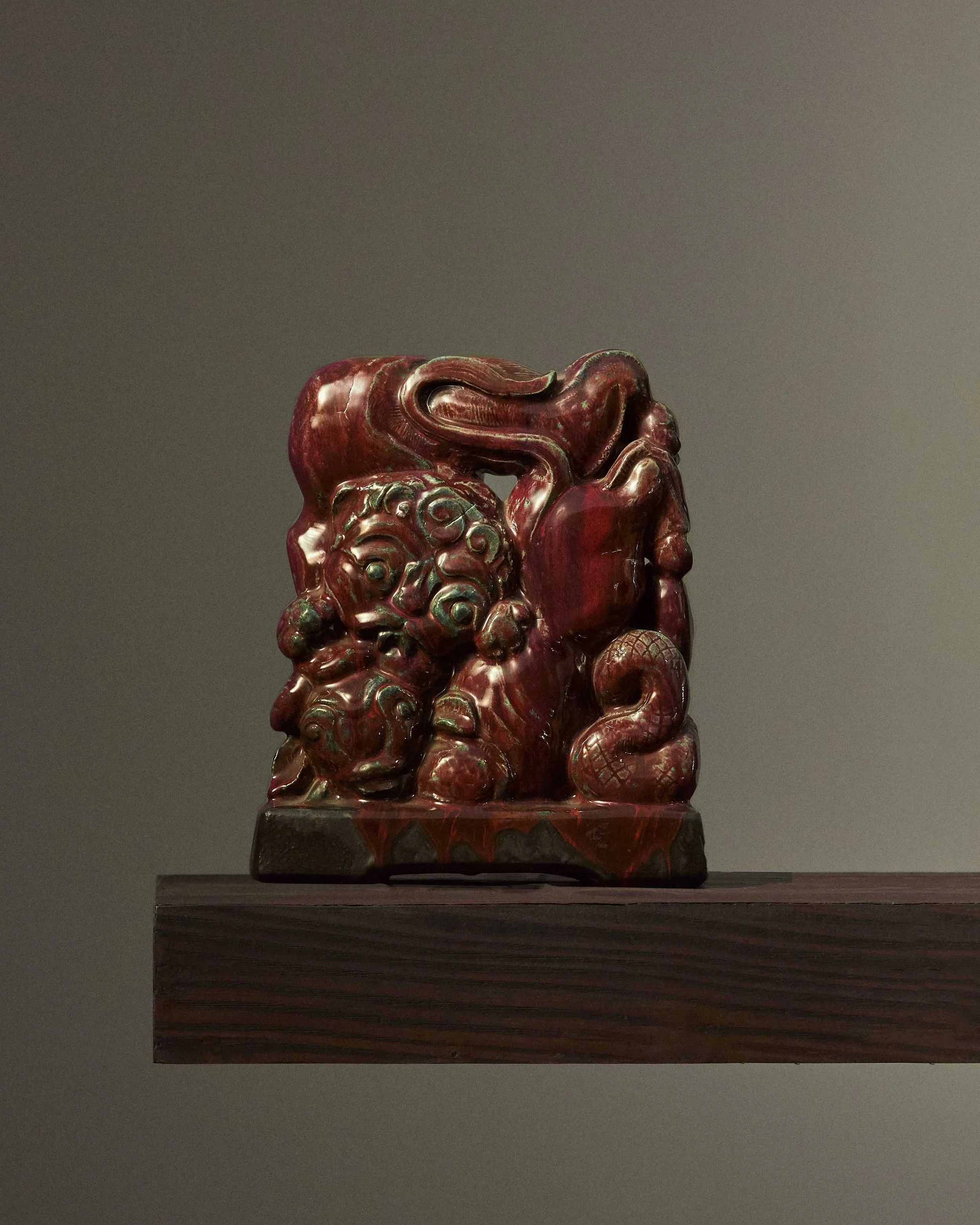 Oxblood and green enameled stoneware sculpture of a lion, a bull and a snake fighting