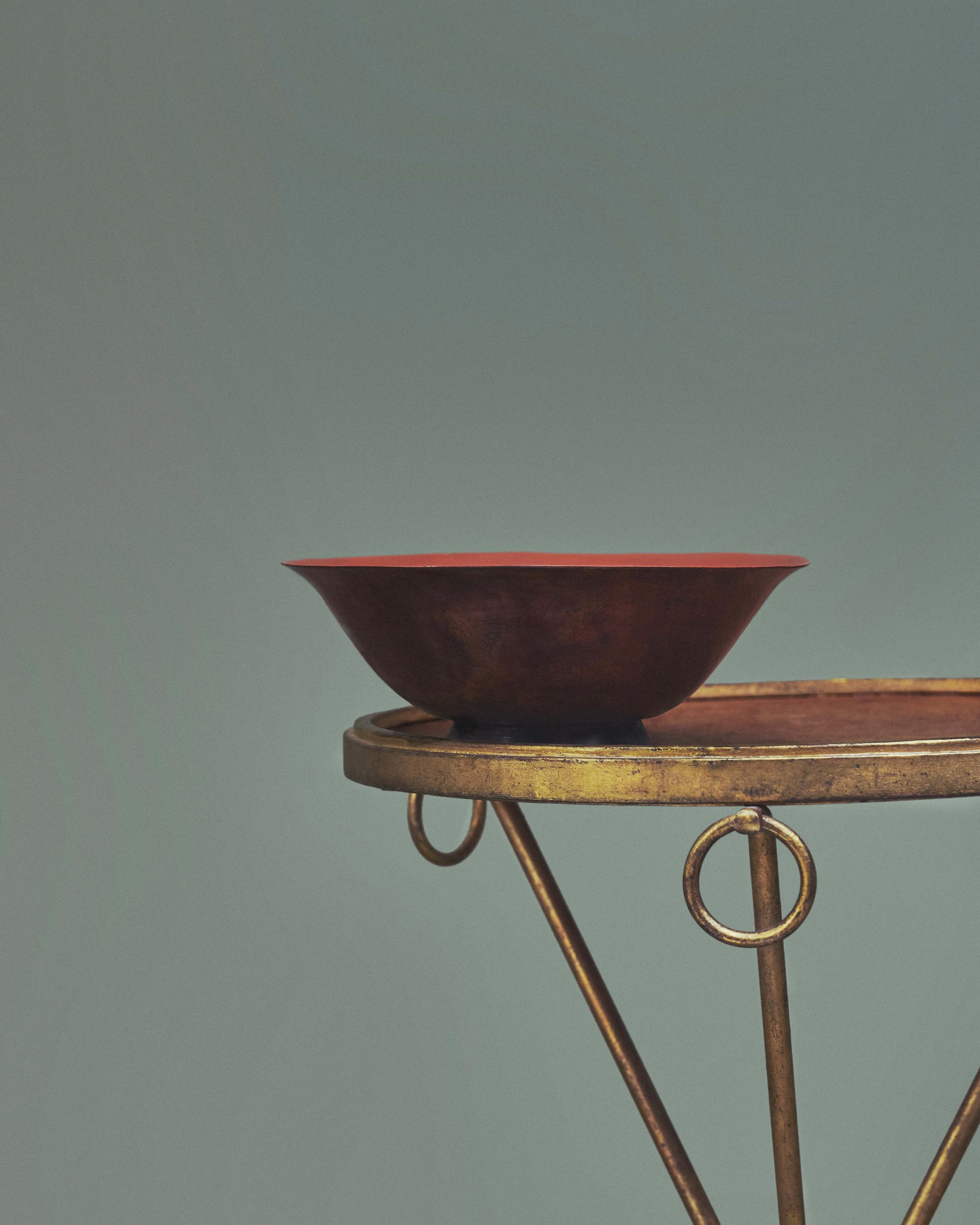 Stemmed bowl in lacquered metal, golden brown on the outside and coral